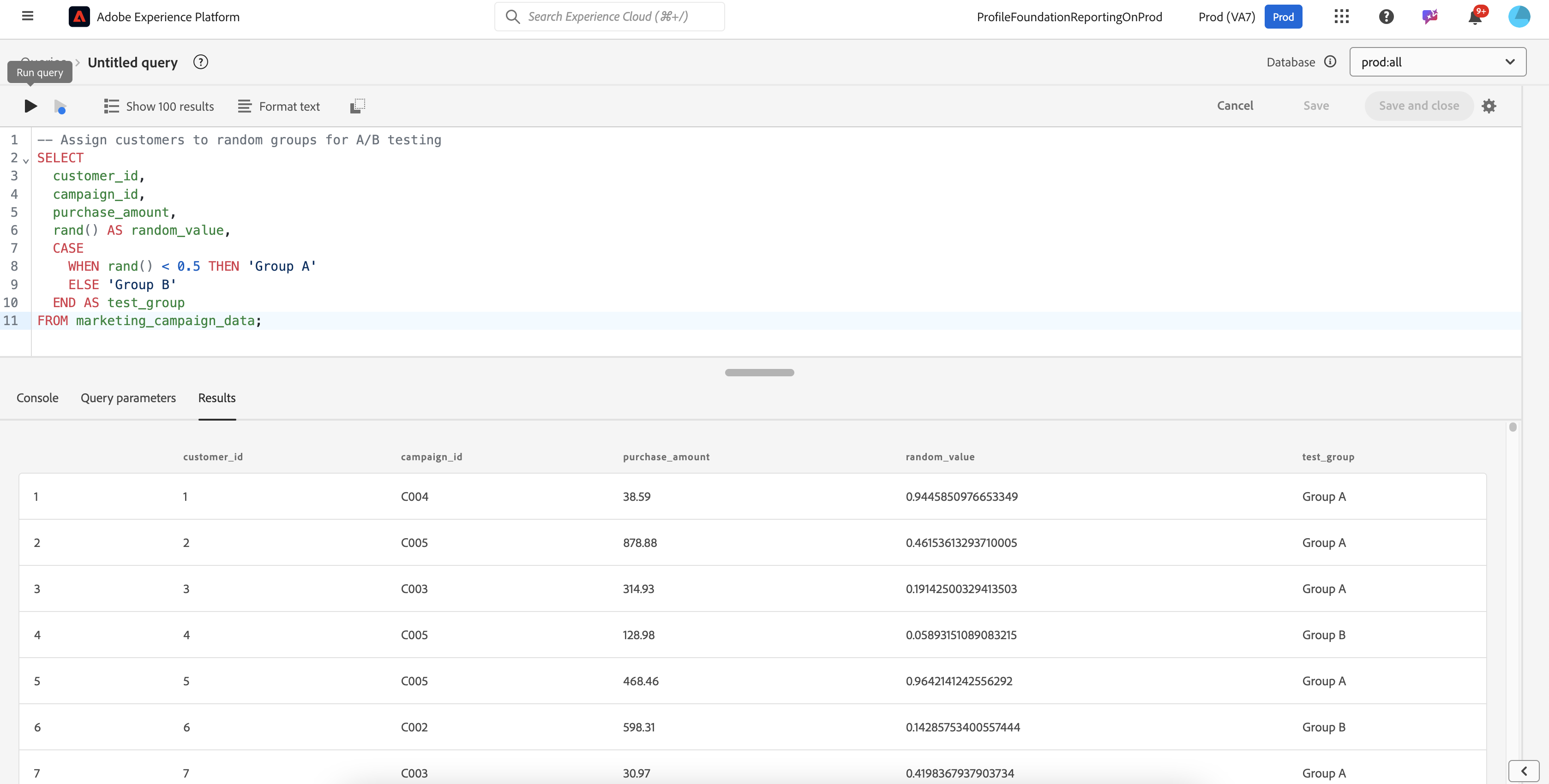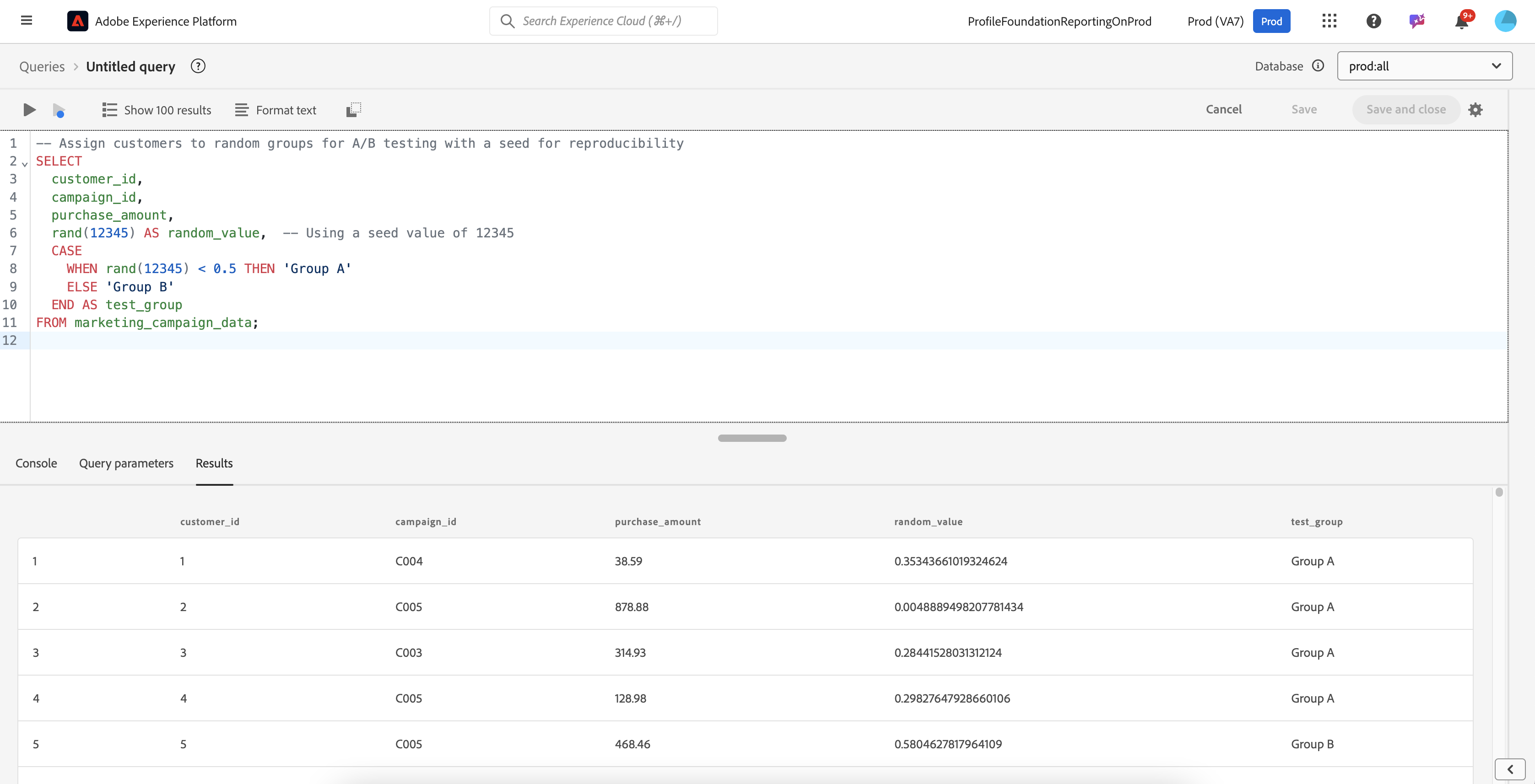 In this example, customers are assigned randomly to **Group A** or **Group B** based on the random value generated by `rand()`.