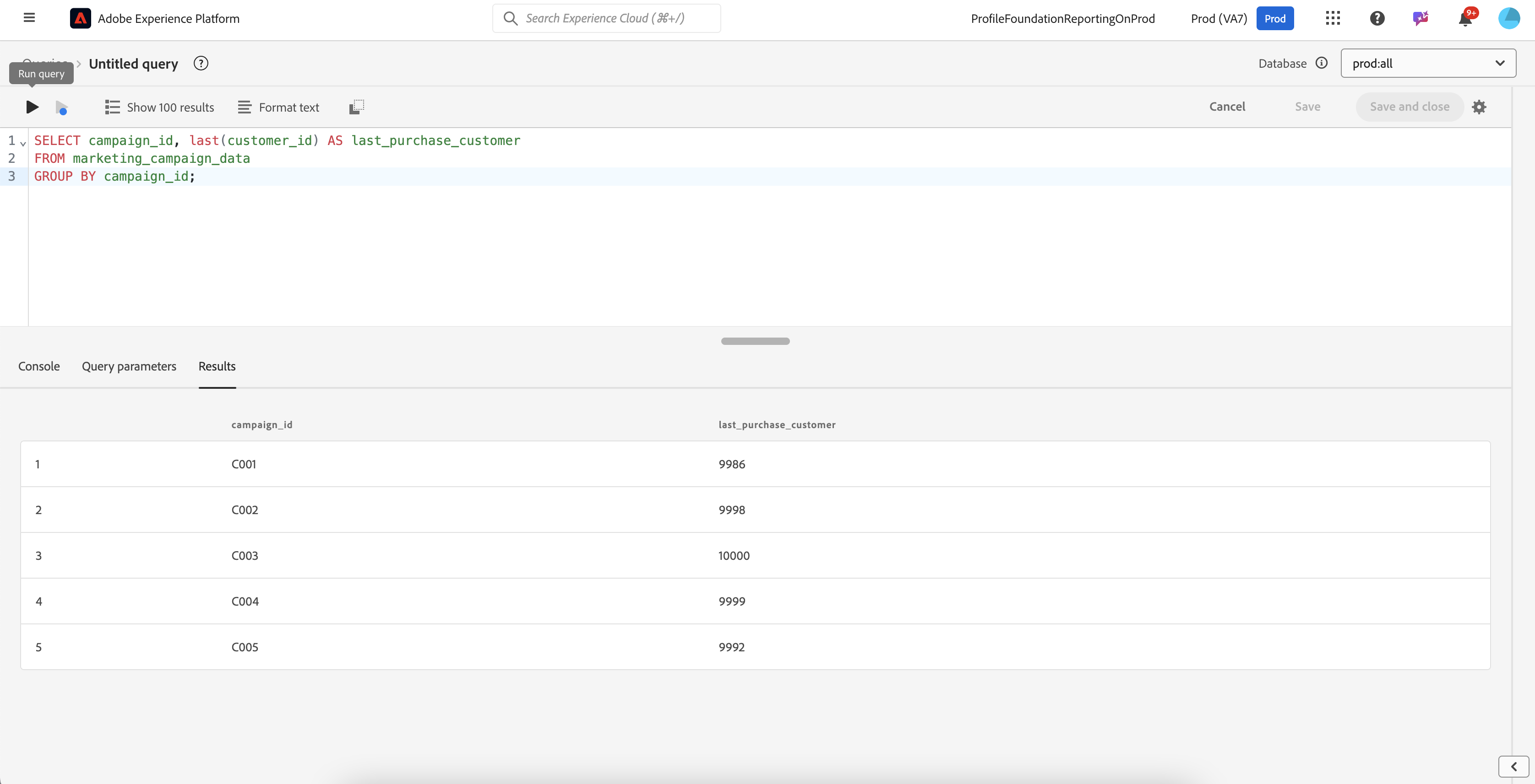 SELECT campaign_id, last(customer_id) AS last_purchase_customer
