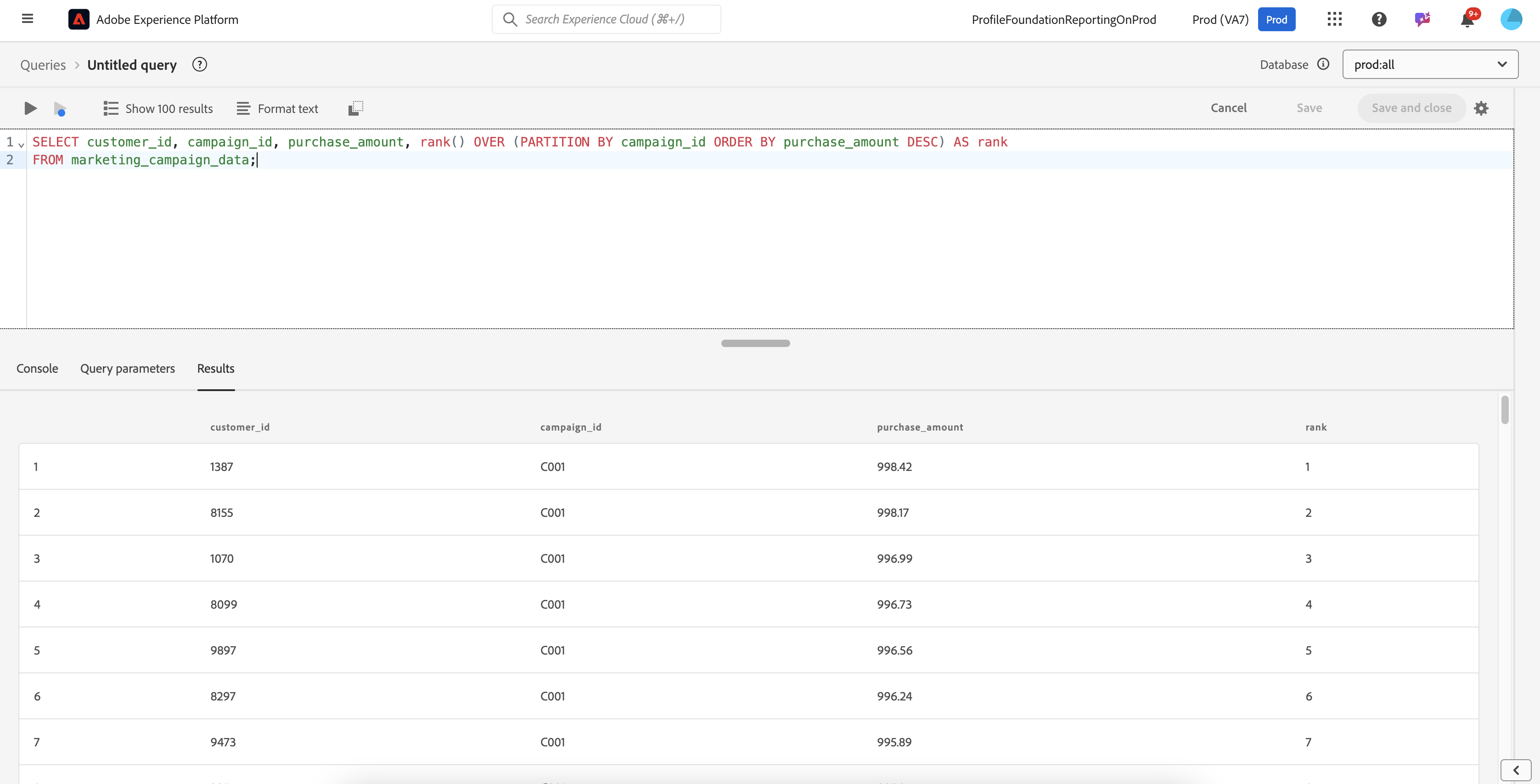 SELECT customer_id, campaign_id, purchase_amount, rank() OVER (PARTITION BY campaign_id ORDER BY purchase_amount DESC) AS rank