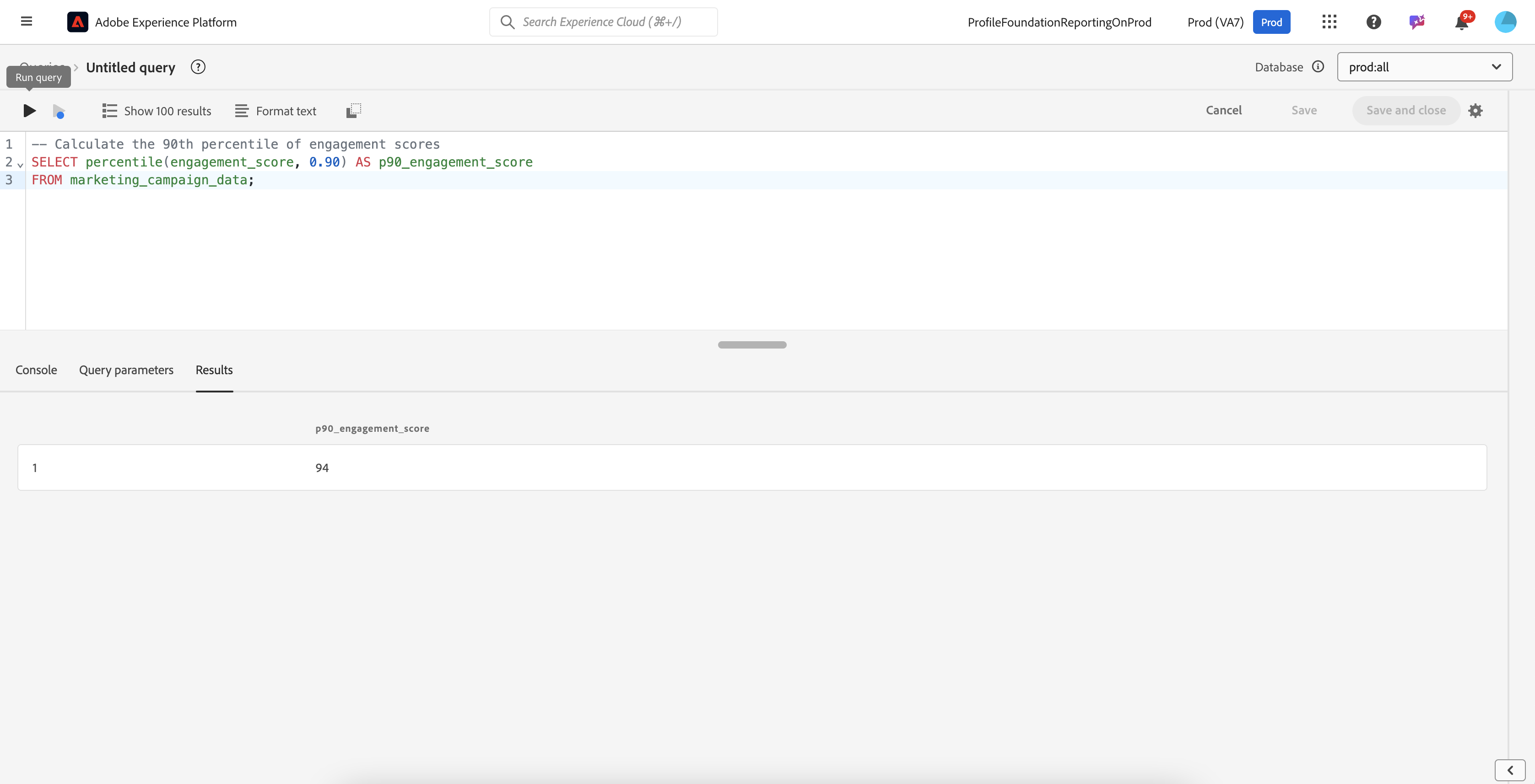 SELECT percentile_disc(0.90) WITHIN GROUP (ORDER BY engagement_score) AS p90_engagement_score