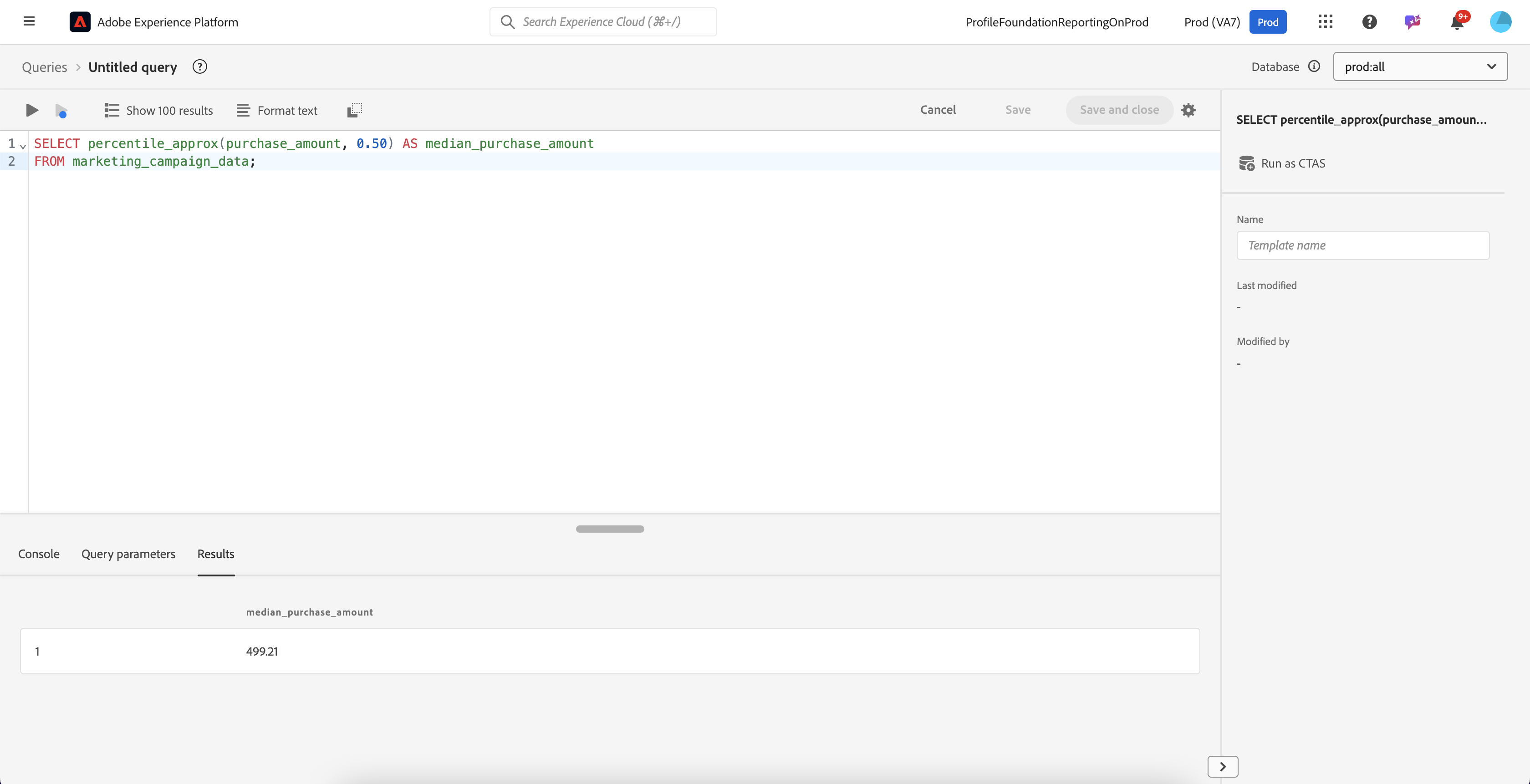 SELECT percentile_approx(purchase_amount, 0.50) AS median_purchase_amount