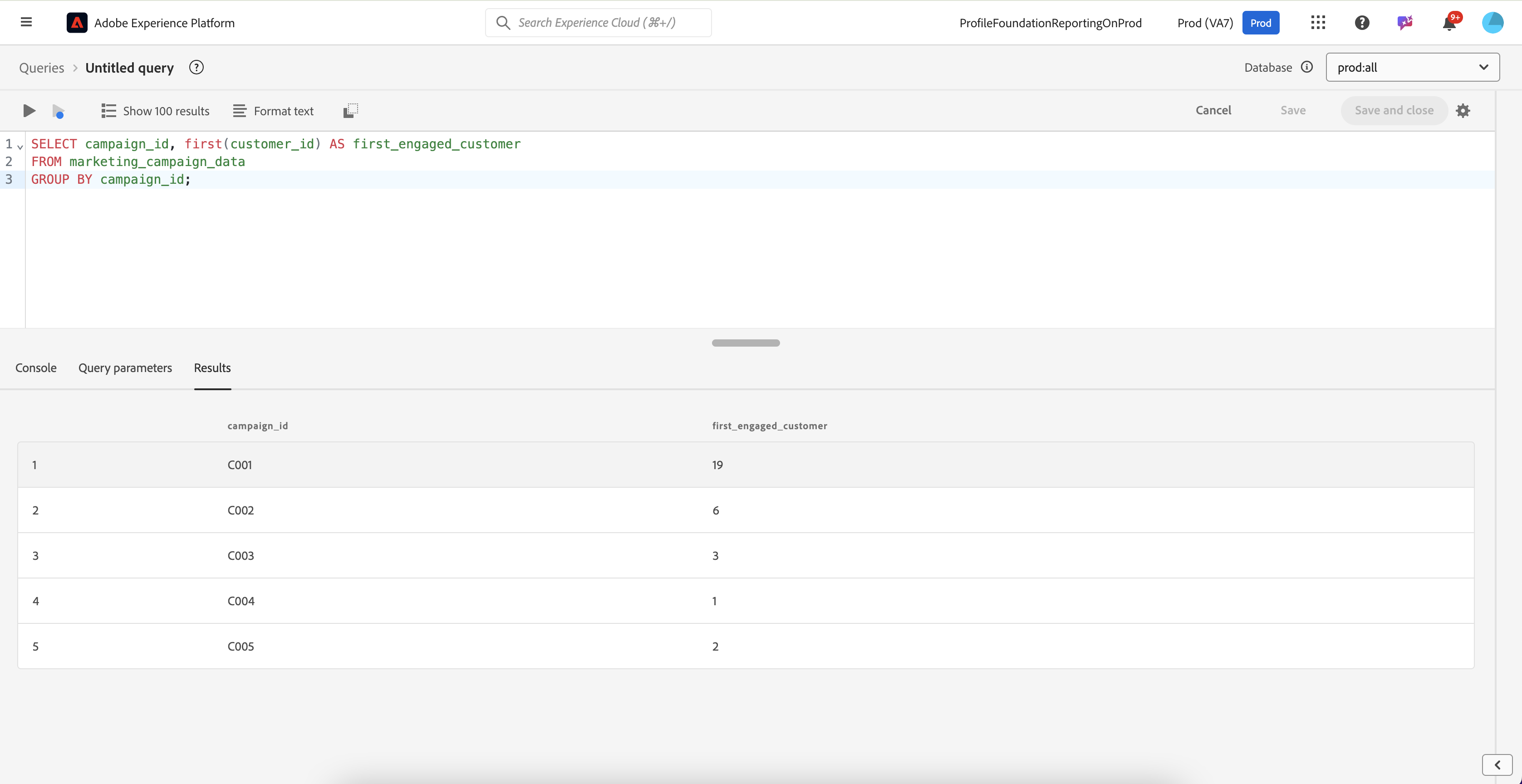 SELECT campaign_id, first(customer_id) AS first_engaged_customer