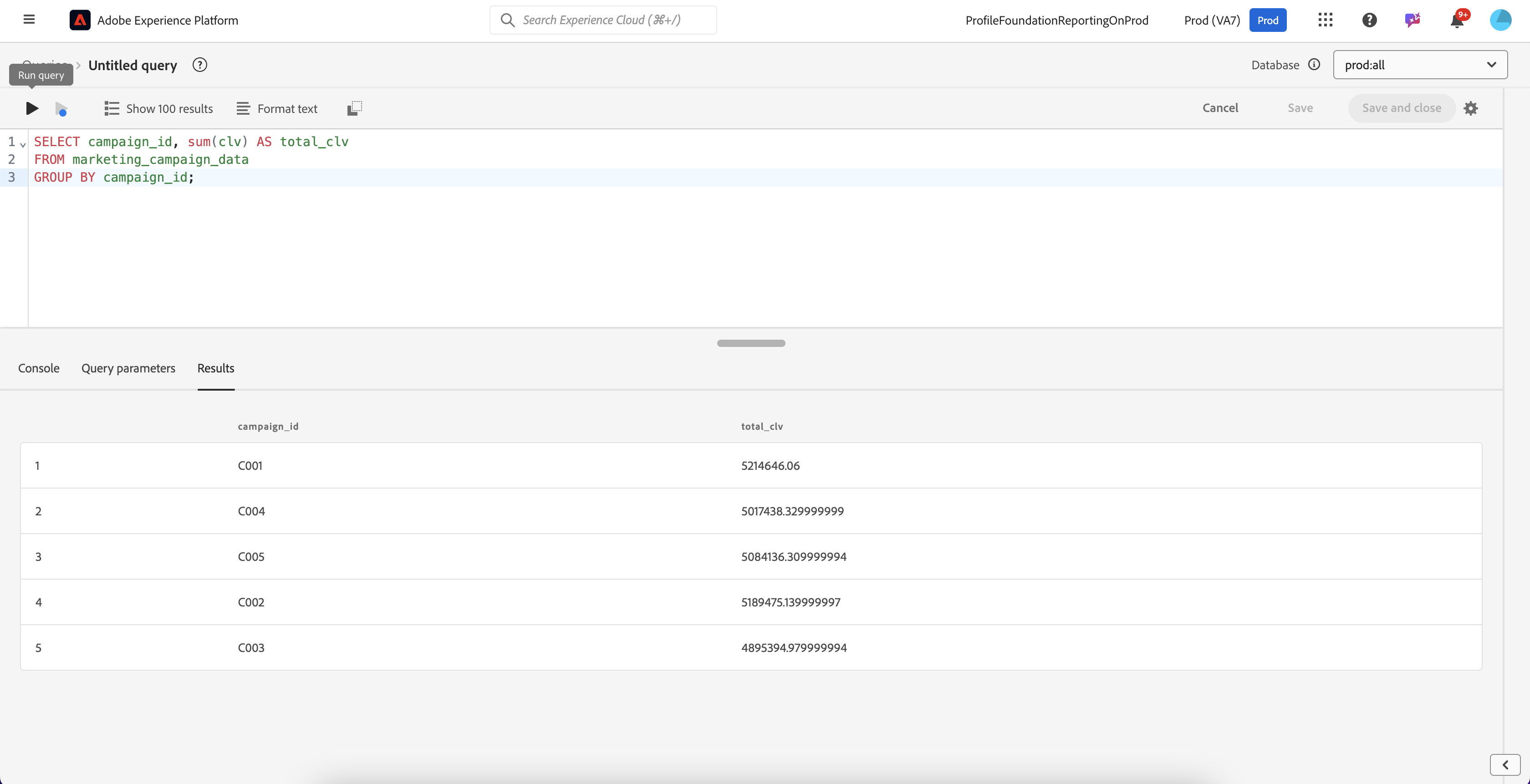 Let us calculate the total customer lifetime value (CLV) for all customers engaged in a specific campaign.