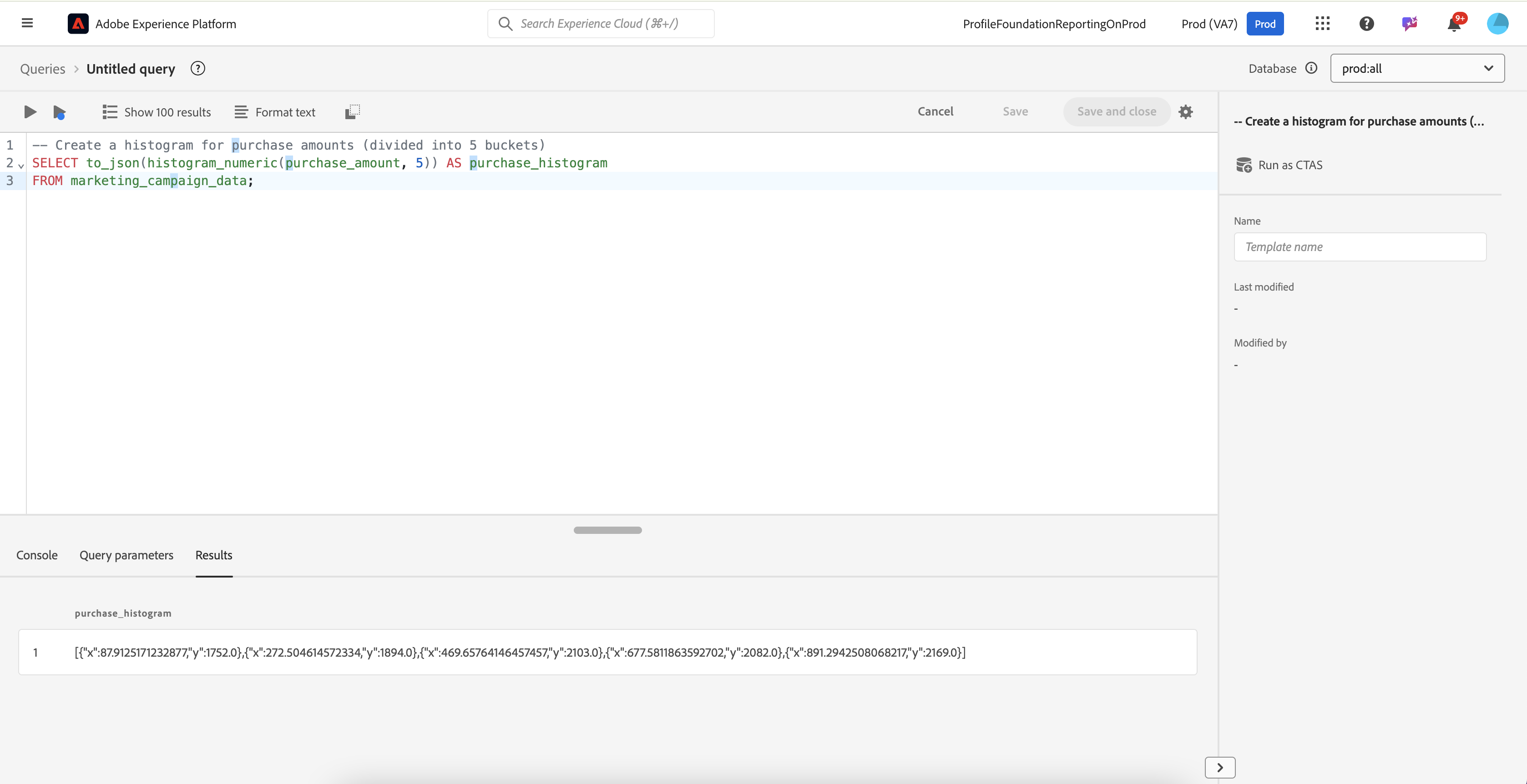 SELECT to_json(histogram_numeric(purchase_amount, 5)) AS purchase_histogram
