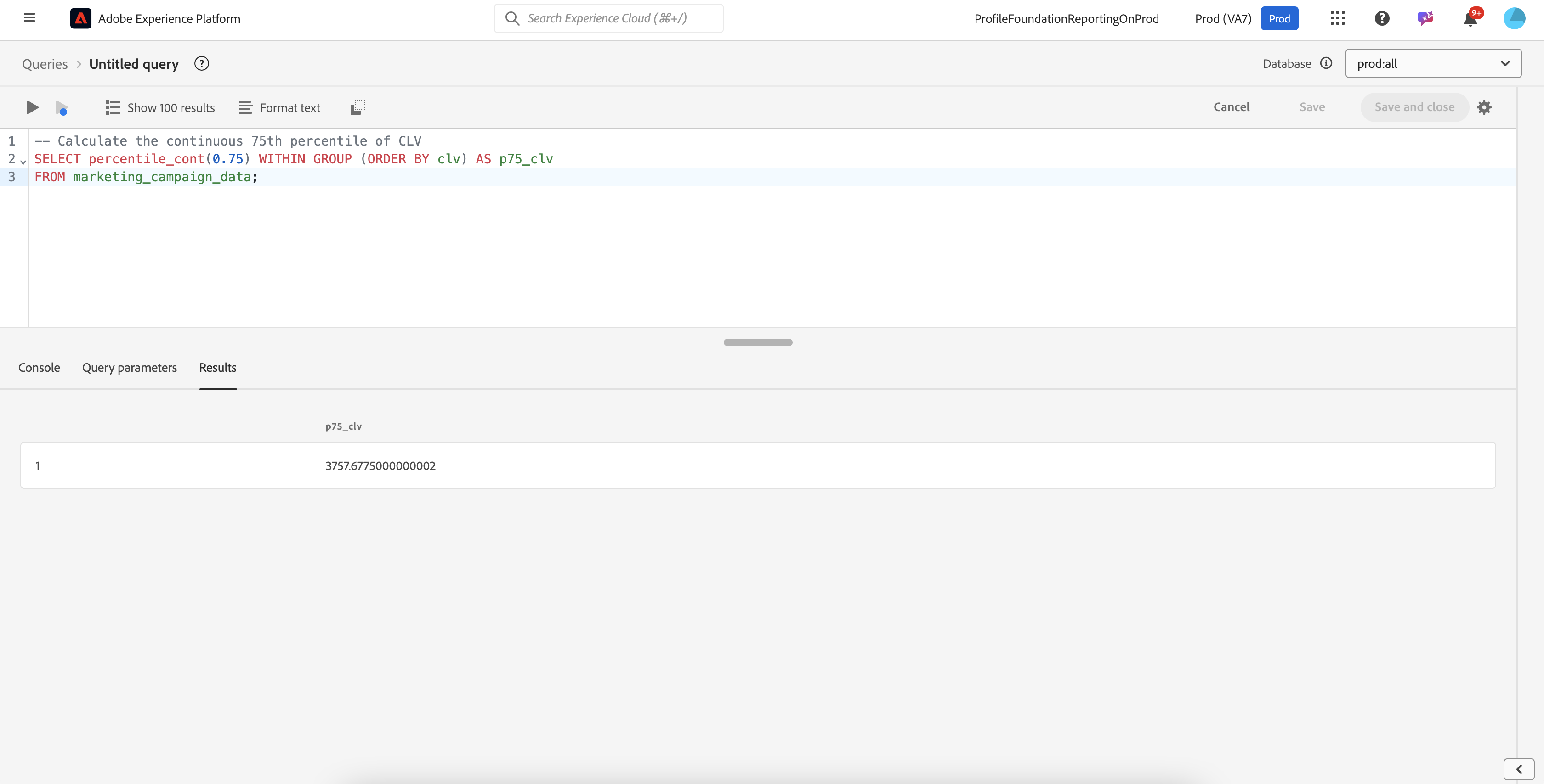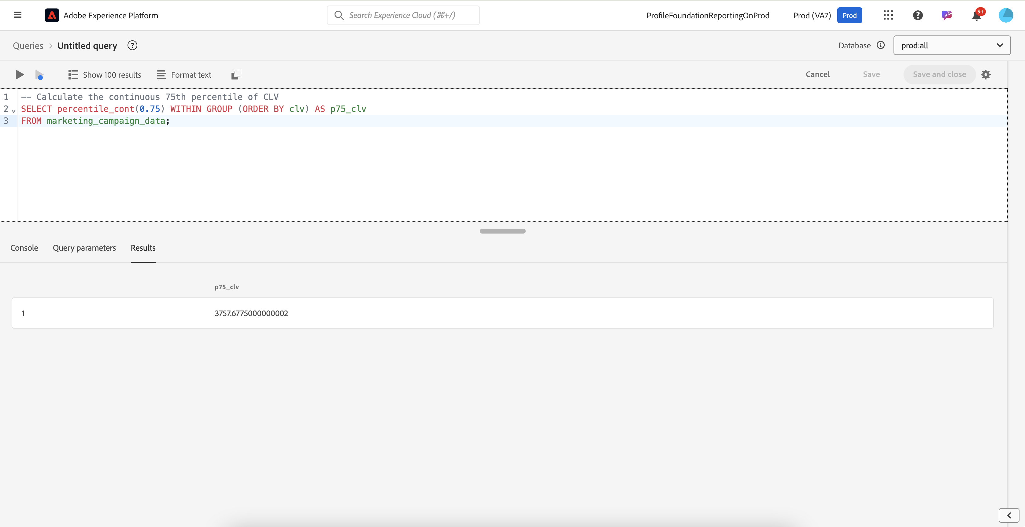 SELECT percentile_cont(0.75) WITHIN GROUP (ORDER BY clv) AS p75_clv