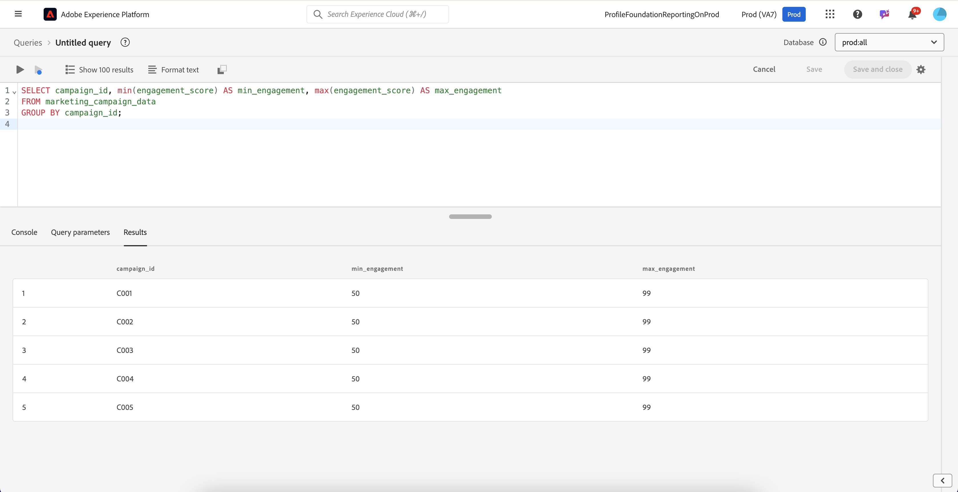 SELECT campaign_id, min(engagement_score) AS min_engagement, max(engagement_score) AS max_engagement