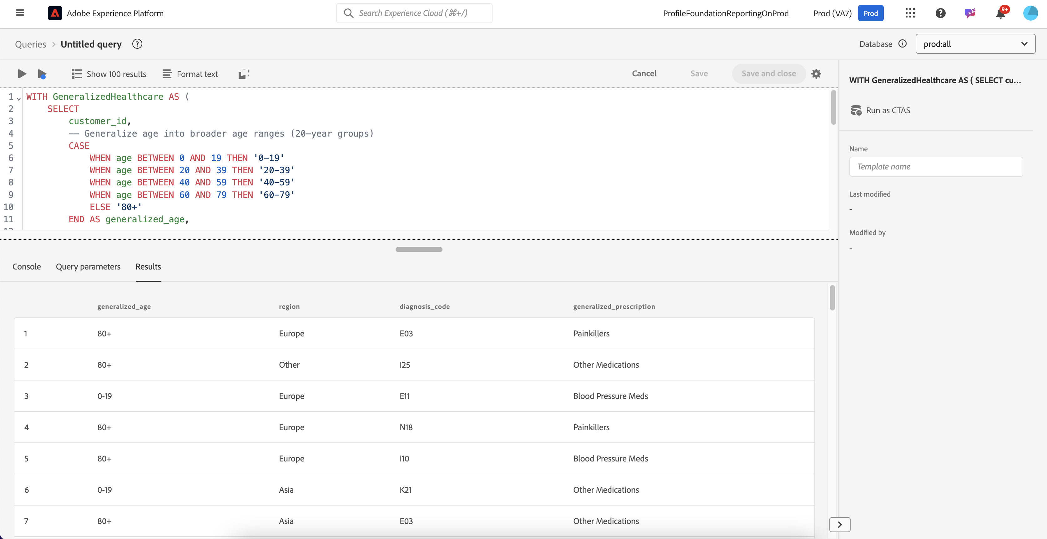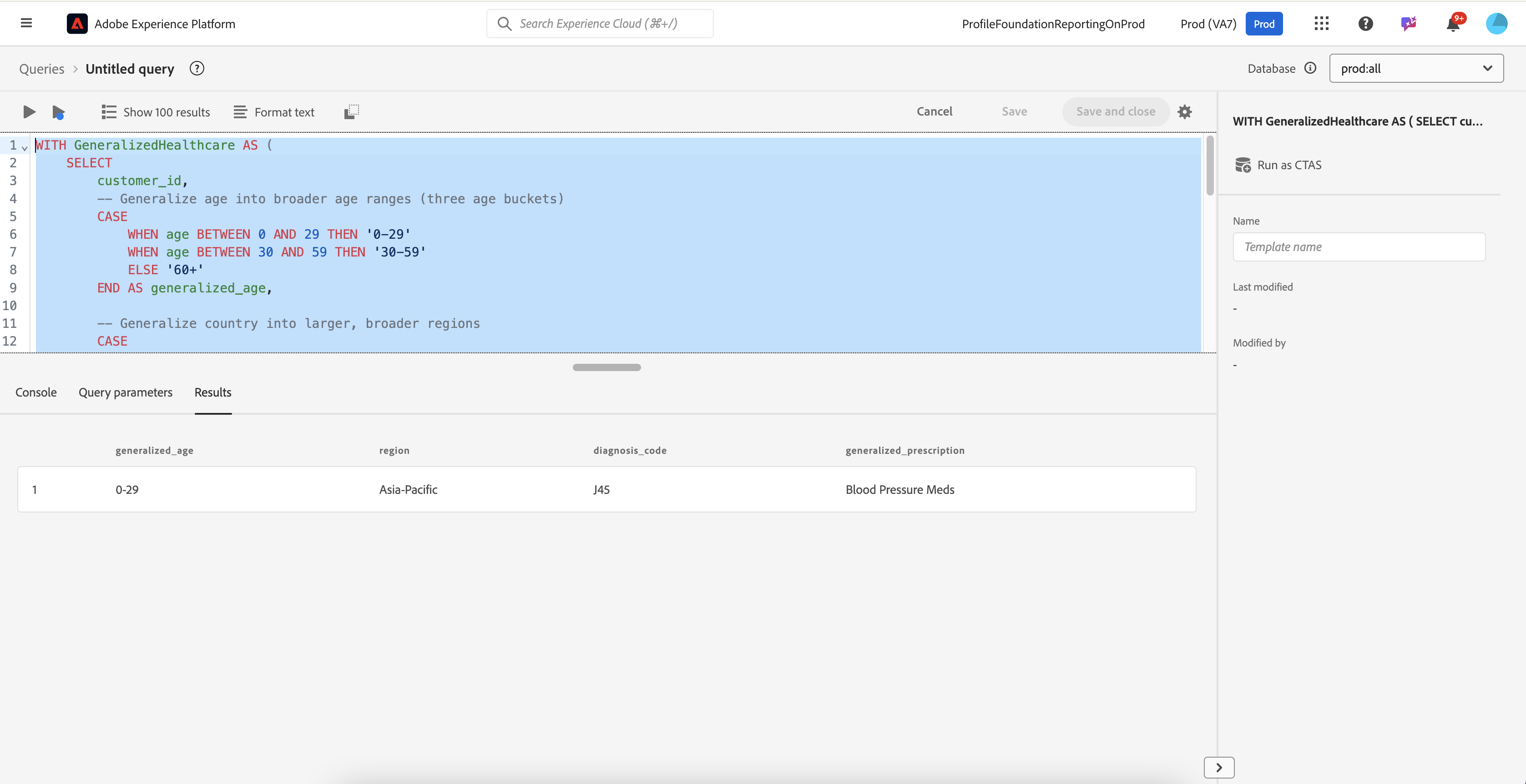 The query generalizes sensitive healthcare data to ensure privacy by grouping records based on broad categories. First, it generalizes the `age` into 20-year ranges (e.g., `0-19`, `20-39`), and the `country` is grouped into broad regions (e.g., `Asia`, `Europe`). The `prescription` field is also generalized into broader categories like **Painkillers**, **Antibiotics**, and **Blood Pressure Meds**, with any unlisted medications categorized as **Other Medications**. The dataset is then grouped by these generalized dimensions, including `diagnosis_code`. Our hope is that the `HAVING COUNT(*) == 1` clause will return no results as no bucket of these grouping dimensions should have an individual in it.