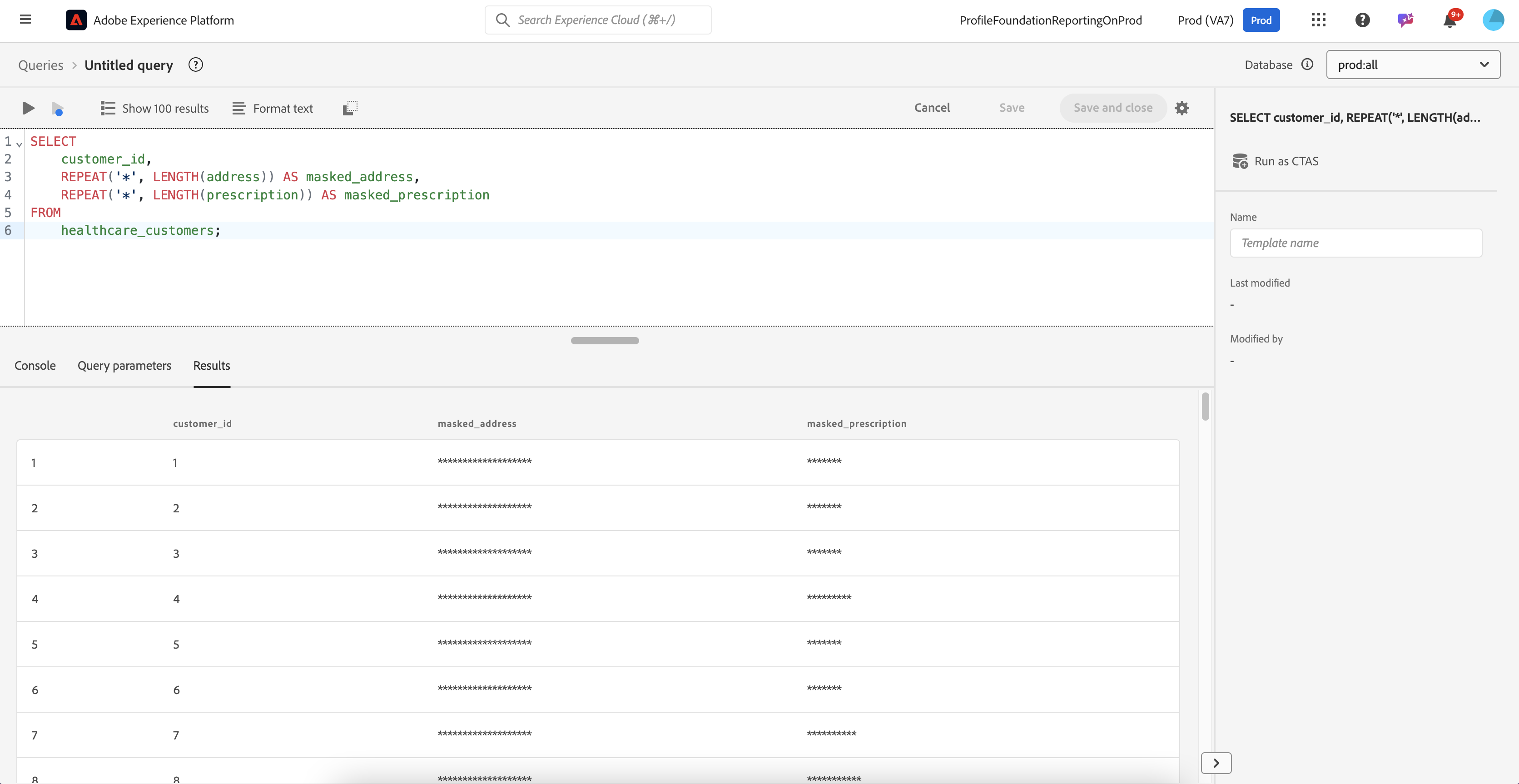 This query masks the `address` and `prescription` fields entirely by replacing each character with an asterisk (\*), making the data unreadable.