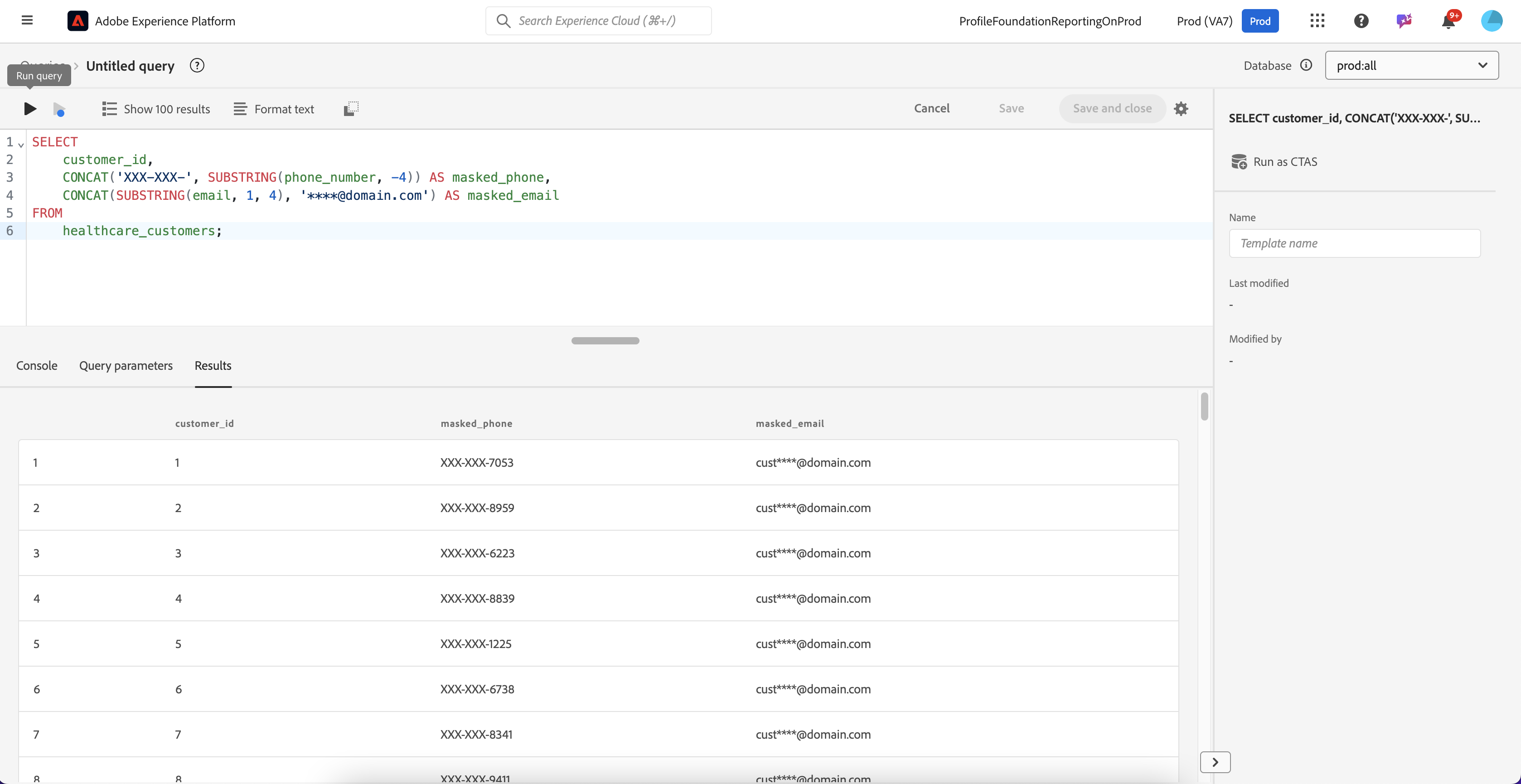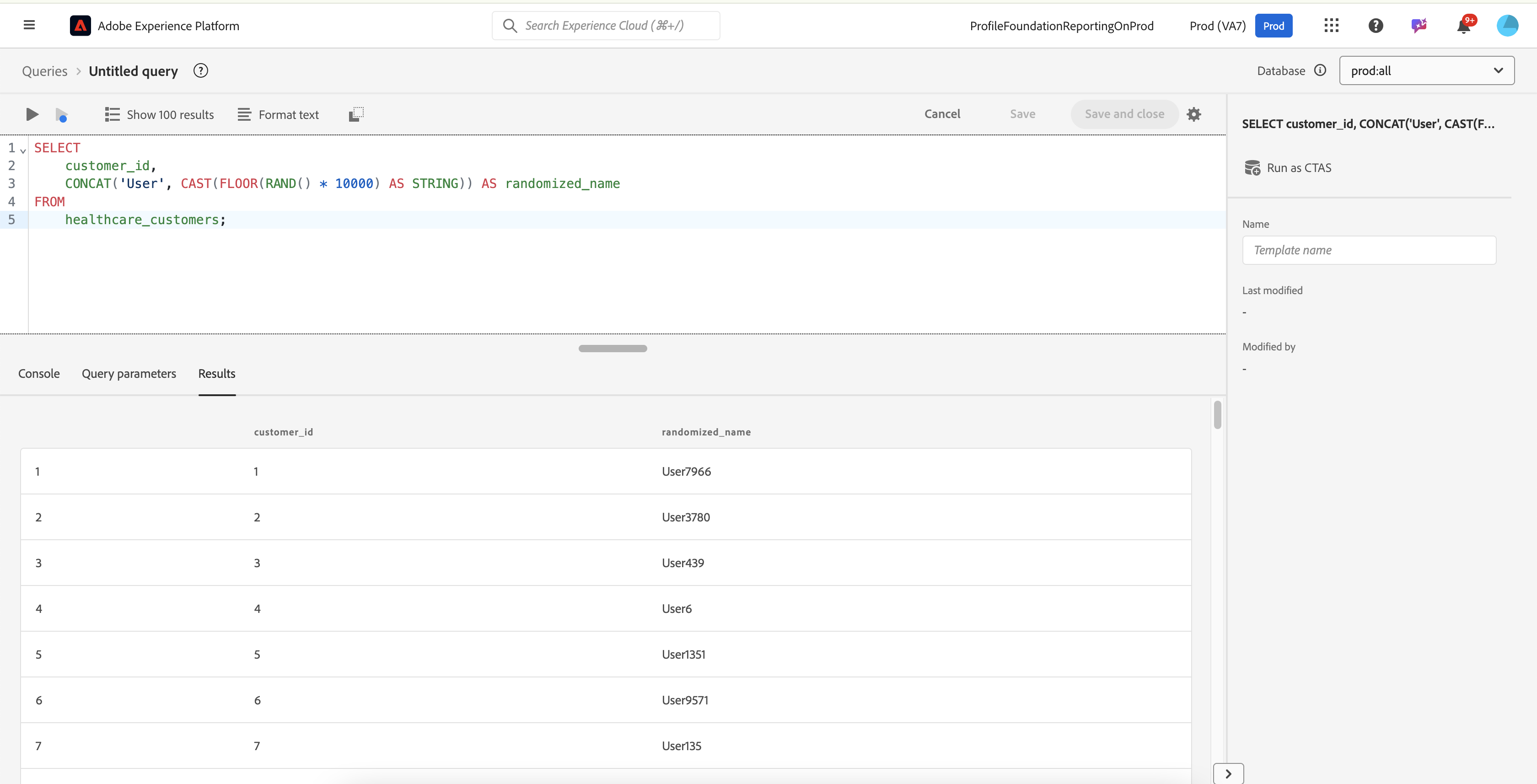 This query replaces customer names with random identifiers like `User1234`, ensuring names are obfuscated.