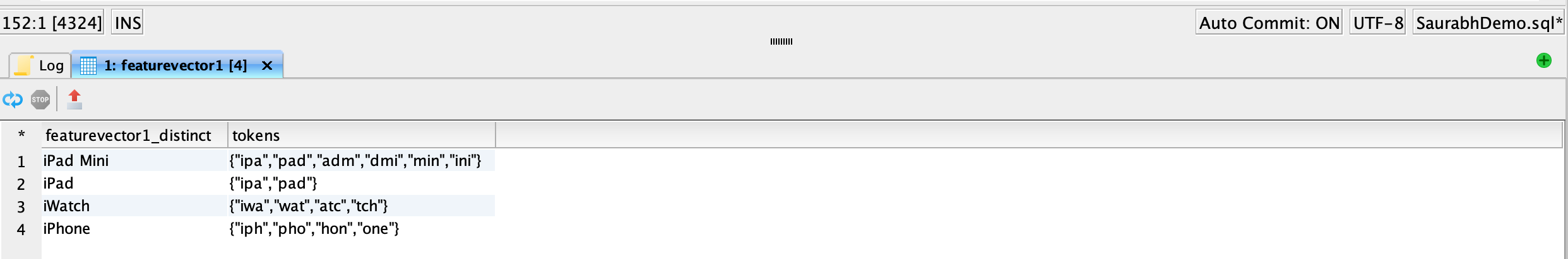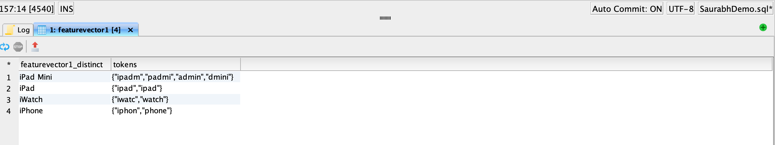 SELECT * FROM featurevector1tokenized;