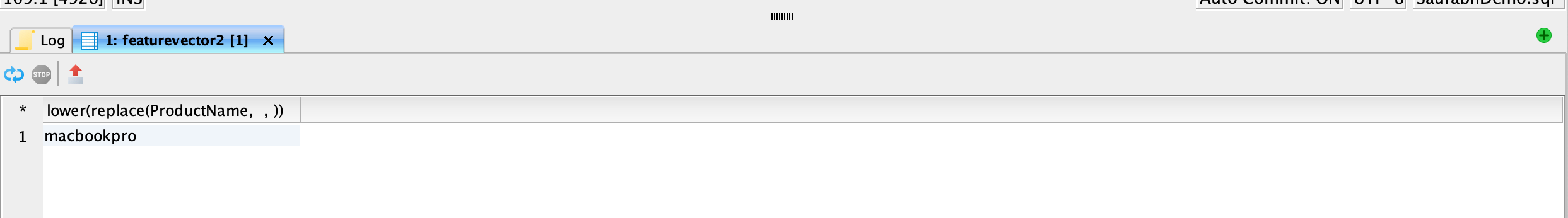 SELECT lower(replace(ProductName, ' ', '')) FROM featurevector1;